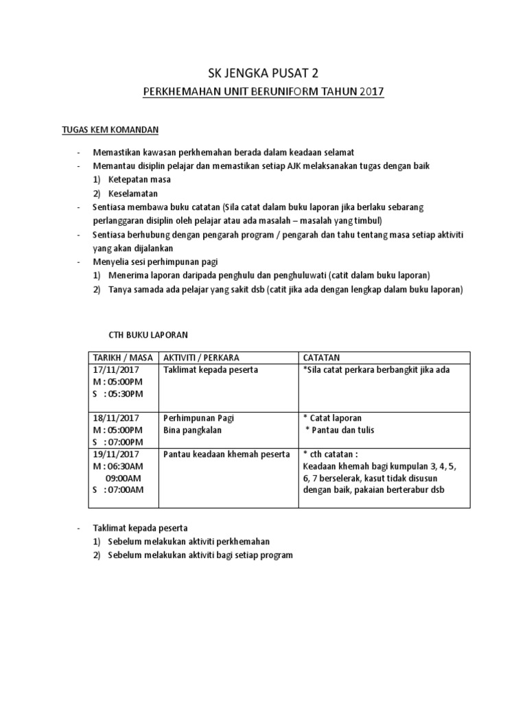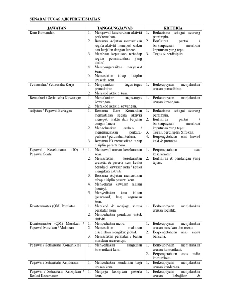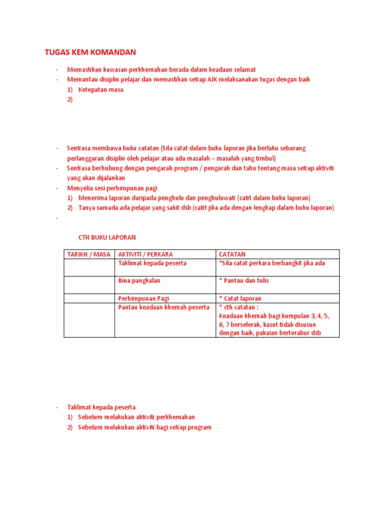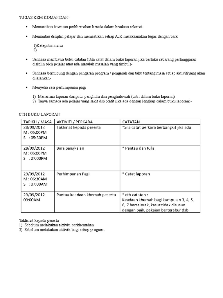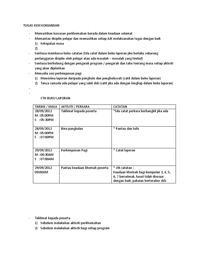 Tugas Kem Komandan Pdf Program Puan Suhaili binti Abdullah Setiausaha Kokurikulum Kem Komandan Encik Shah Nor Amir bin Saad Penolong Kem Puan Napisah binti Ahmad Komandan. TUGAS KEM KOMANDAN Memastikan Kawasan Perkhemahan Berada Dalam Keadaan Selamat Memantau Disiplin Pelajar Dan Memastikan.